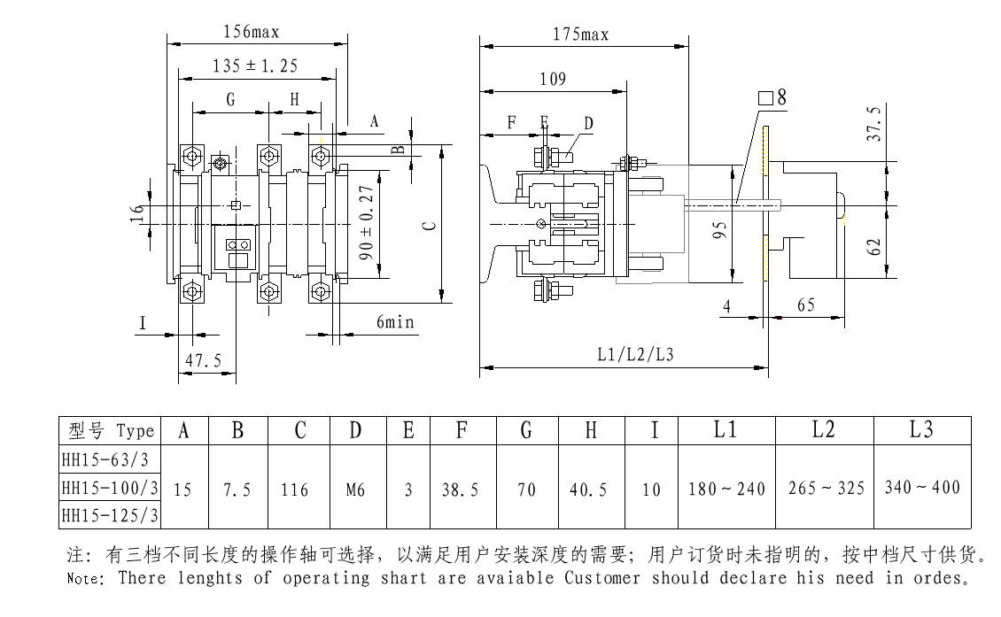 本系列開關(guān)由刀型靜觸頭、滾動動觸頭及滅弧裝置組成的接觸系統(tǒng)均組裝在由耐弧工程塑料制成的封閉底座內(nèi),能達到零飛弧。操作機構(gòu)由具有彈簧儲能的連桿傳動機構(gòu)構(gòu)成,靠彈簧力完成開關(guān)的分、合,使開關(guān)動作無關(guān)人力操作。手柄由操作手柄和傳動軸等構(gòu)成,屬旋轉(zhuǎn)操作方式。當手柄旋轉(zhuǎn)操作時,使操作機構(gòu)彈簧儲能,靠儲能的彈簧力釋放帶動動觸頭與靜觸頭形成合、分兩種狀態(tài),從而達到開關(guān)分合主電路的目的。